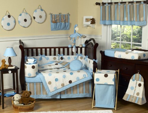 JoJo Designs Blue and Chocolate Mod Dots 9 pc baby bedding ensemble has all that your little one will need. This modern baby bedding set uses exclusive JoJo Designer coordinating 100% cotton prints. The 3 prints are made in a color palette of soft blue, cocoa brown, white and chocolate. They include large dots, bold stripes, and mini dots prints. It will create a stylish room that your little one is sure to enjoy. This set comes is made by JoJo Designs and fits all standard size cribs and toddler beds. The 9 pcs. included in this set are: quilt, crib bumper, crib skirt (Dust Ruffle), fitted sheet, toy bag, decorative throw pillow, diaper stacker, and 2 window valances. JoJo Designs creates various coordinating room accessories for all of their children's bedding sets including mobiles, lampshades, changing pads, and wall decor. JoJo Designs produces only high quality items, and every piece is non allergenic.
